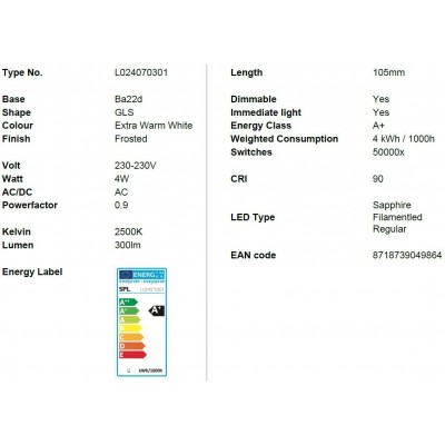 Ba22d LED vlákno GLS A60x105mm 300Lm 4W 925 TR-stmívatelná matná