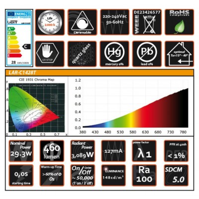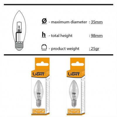 Halogenová žárovka 28W/363 lm s paticí E14, určena pro připojení na napětí 240V, váha 25g, délka 98 mm, průměr 35 mm, stmívatelná, úhel svítivosti 360º, barevné teplotě 2700ºK (žluté světlo). 30% úspora, náhrada za 40W klasickou žárovku. Energetická třída C. Neobsahuje rtuť ani olovo. Životnost 2.000 h. Záruka 24 měsíců.