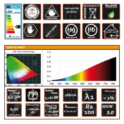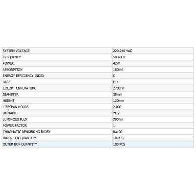 Halogenová žárovka 42W/592 lm s paticí E14, určena pro připojení na napětí 240V, váha 25g, délka 98 mm, průměr 35 mm, stmívatelná, úhel svítivosti 360º, barevné teplotě 2700ºK (žluté světlo). 30% úspora, náhrada za 60W klasickou žárovku. Energetická třída C. Neobsahuje rtuť ani olovo. Životnost 2.000 h. Záruka 24 měsíců.