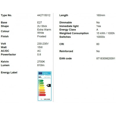 CFL E27 2U Sticks 230V 15W 41x160 810Lm 2700K 10.000h