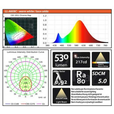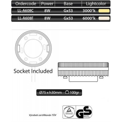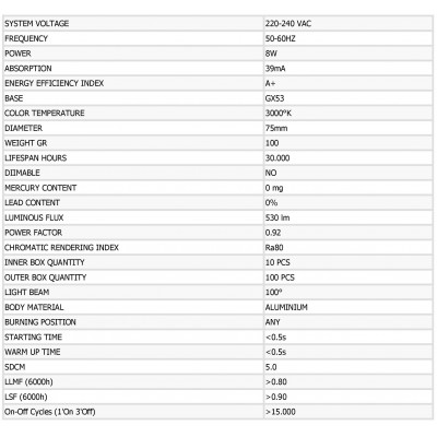 LED žárovka o výkonu 8W, napájecím napětí 220-240V 50-60Hz, barevné teplotě 3000°K, s paticí G53, Ra80, 530 lm. Vhodná ke všeobecnému použití. Životnost 30.000 h. Záruka 24 měsíců.