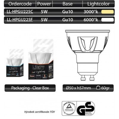 LED žárovka o výkonu 5 W, napájecím napětí 220-240V AC, barevné teplotě 3000°K, s paticí GU10, 360 lm, Ra82. Vhodná ke všeobecnému použití. Životnost 30.000 h. Záruka 24 měsíců.