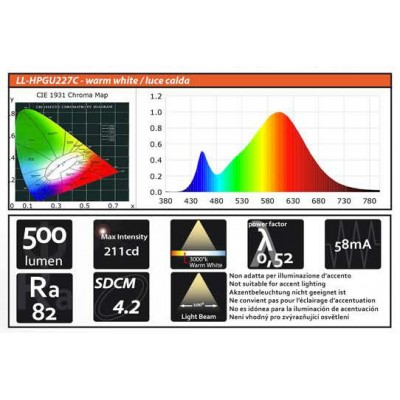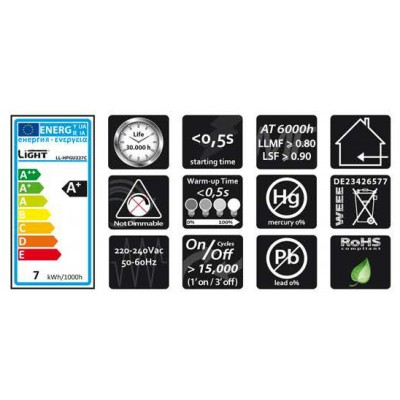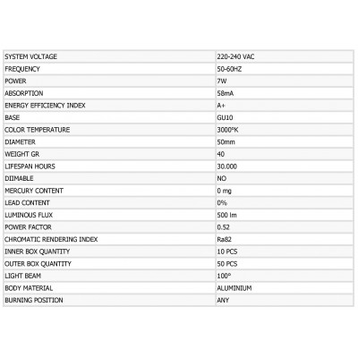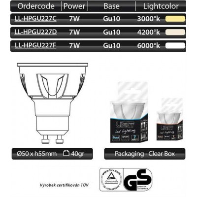 LED žárovka o výkonu 7 W, napájecím napětí 220-240V AC, barevné teplotě 3000°K, s paticí GU10, 500 lm, Ra82. Vhodná ke všeobecnému použití. Životnost 30.000 h. Záruka 24 měsíců.