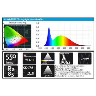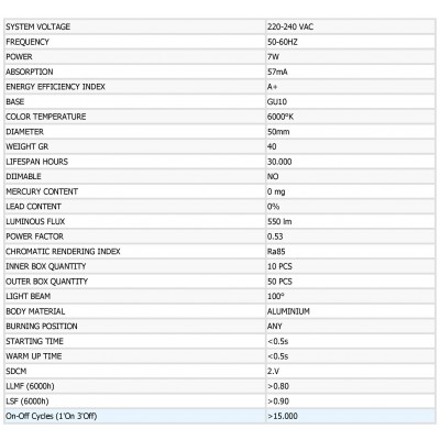 LED žárovka o výkonu 7 W, napájecím napětí 220-240V AC, barevné teplotě 6000°K, s paticí GU10, 550 lm, Ra85. Vhodná ke všeobecnému použití. Životnost 30.000 h. Záruka 24 měsíců.