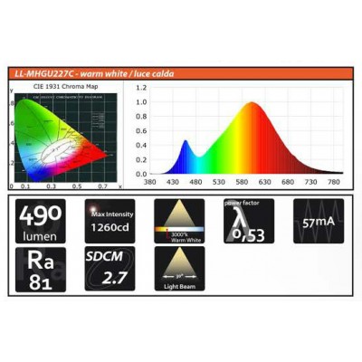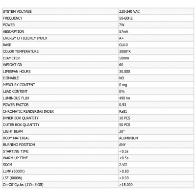 LED žárovka o výkonu 7 W, napájecím napětí 220-240V – 50Hz, barevné teplotě 3000°K, s paticí GU10. Vhodná ke všeobecnému použití. Životnost 30.000 h. Záruka 24 měsíců.