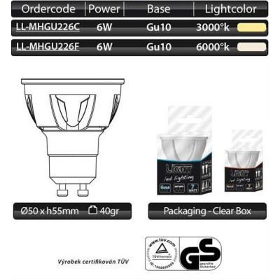 LED žárovka o výkonu 6 W, napájecím napětí 220-240V AC, barevné teplotě 6000°K, s paticí GU10, svítivostí 465 lm, index podání barev Ra82. Vhodná ke všeobecnému použití. Životnost 30.000 h. Záruka 24 měsíců.