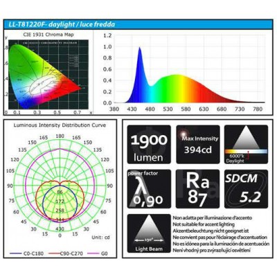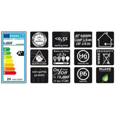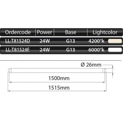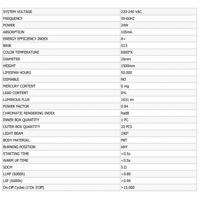 LED zářivka o výkonu 24 W, napájecím napětí 220-240V, 50-60Hz, barevné teplotě 6000°K, s paticí G13, svítivostí 1950 lm. Vhodná ke všeobecnému použití. Životnost 50.000 h. Záruka 24 měsíců.