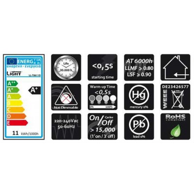 LED zářivka o výkonu 11 W, napájecím napětí 220-240V, 50-60Hz, barevné teplotě 4200°K, s paticí G13, svítivostí 700 lm, index podání barev Ra83. Vhodná ke všeobecnému použití. Životnost 50.000 h. Záruka 24 měsíců.