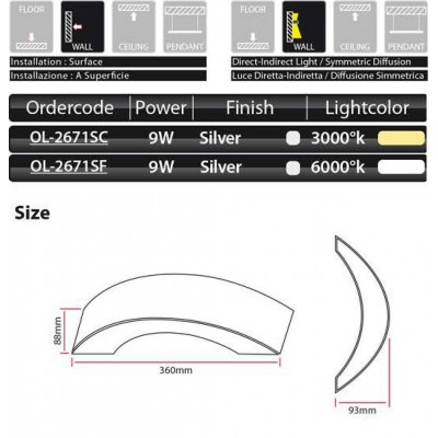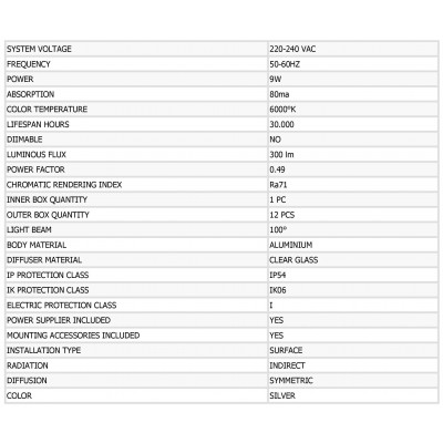 LED nástěnné svítidlo venkovní 9 W 6000°K 220-240V 50-60Hz 40.000h