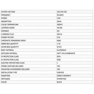 LED nástěnné svítidlo venkovní. 12W.Materiál hliník.Barva černá.Určeno pro vnější použití IP54. Balení OBSAHUJE světelný zdroj (10 LED) a trafo vstup 220V-240V 50-60Hz.Barevné teplotě 3000°K. Není stmívatelná. Životnost 40.000 h. Záruka 24 měsíců.