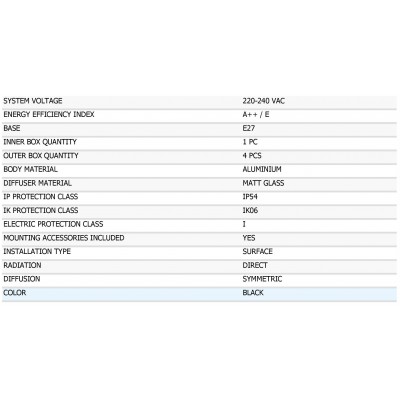 Venkovní svítidlo pro zdroje s paticí E27 (max. 100 x 110 mm) v provedení hliník, stupeň ochrany IP54, barva černá. Zdroje nejsou součástí balení. Šířka / Výška / Hloubka svítidla 266 / 225 / 101 mm. Záruka 24 měsíců.
