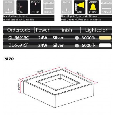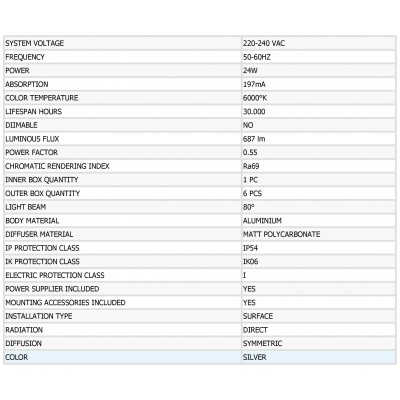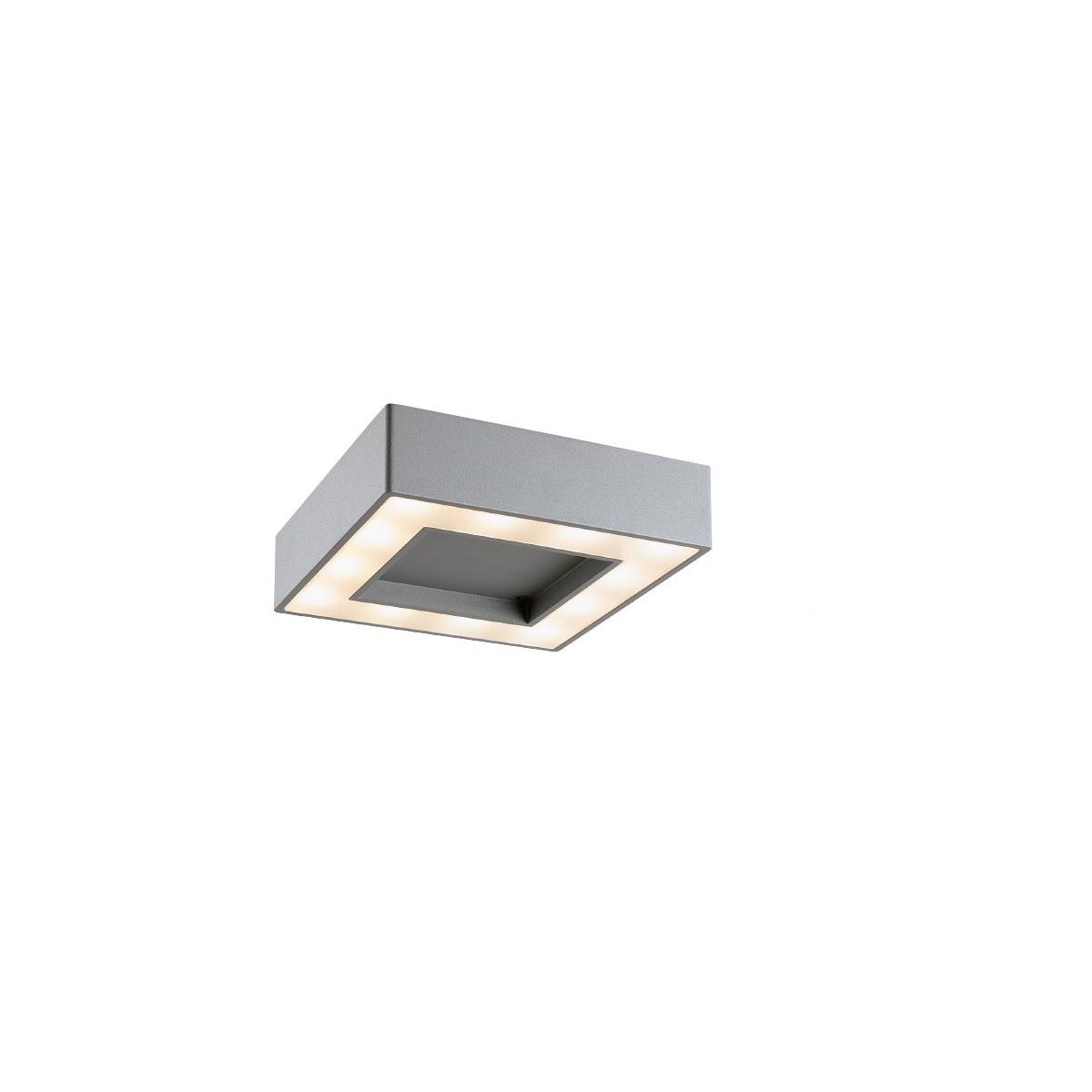 LED stropní svítidlo venkovní čtvercové. 24W.Materiál hliník.Barva matná stříbrná.Určeno pro vnější použití IP54. Balení OBSAHUJE světelný zdroj (12 LED) a trafo vstup 220V-240V 50-60Hz.Barevné teplotě 3000°K. Není stmívatelná. Životnost 40.000 h. Záruka 24 měsíců.