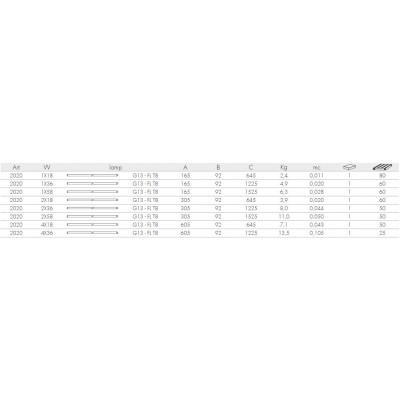 Zářivkové stropní svítidlo – přisazené 1x36W, G13 – FL T8. Materiál pozinkovaná nerez ocel. Předem natřeno polyesterovou pryskyřicí. Lakované bílým epoxypolyesterovým práškem proti žloutnutí, s fosfátem a odmašťovacím předčištěním. Délka svítidla/šířka/výška 1225/165/92 mm. Určeno pro vnitřní použití IP20. IK07. Záruka 24 měsíců.