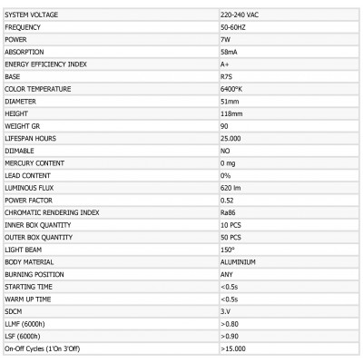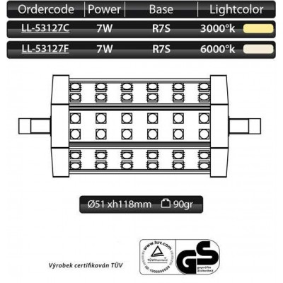 LED žárovka o výkonu 7 W, napájecím napětí 220-240V AC 50-60HZ, barevné teplotě 6400°K, s paticí R7S. 415 lm. Ra81. Není stmívatelná. Vhodná ke všeobecnému použití. Životnost 25.000 h. Záruka 24 měsíců.