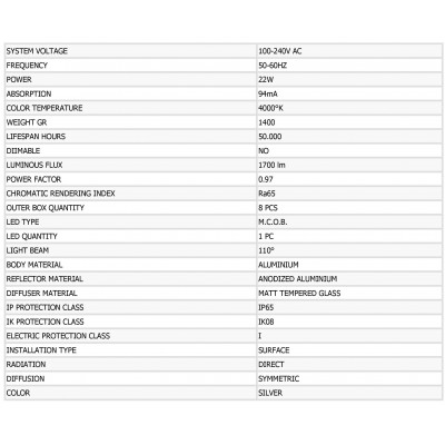 Reflektor LED 22W. Materiál hliník.Barva stříbrná. Určeno pro venkovní použití IP65. Balení OBSAHUJE světelný zdroj (1 LED) a trafo vstup 100V-240V 50-60Hz. Barevné teplotě 4000° K. Světelnost zdroje 1700 lm. Úhel svítivosti 125°. Není stmívatelná. Životnost 50.000 h. Záruka 24 měsíců.