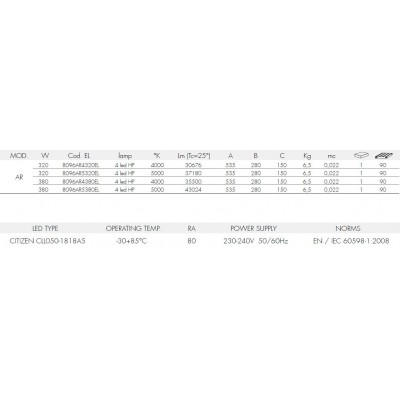 Reflektor LED venkovní 380W, 54.008 lm, 230V. Materiál hliník. Barva stříbrná – matný satén. Určeno pro venkovní i vnitřní použití IP65. IK08. Balení OBSAHUJE světelný zdroj (4 LED HP). Barevné teplotě 5.000°K. Není stmívatelná. Minimální životnost 50.000 h. Záruka 24 měsíců.