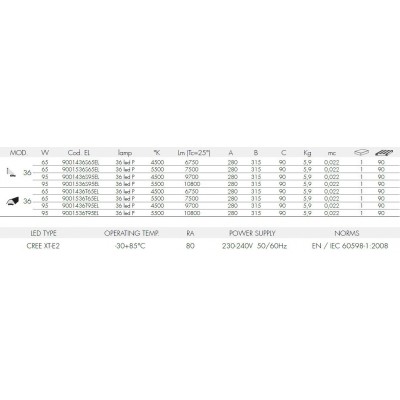 LED lampa – pouliční osvětelní 65W, 6.750 lm (Tc=25°), 230V. Materiál hliník. Barva stříbrná – matný satén. Určeno pro venkovní i vnitřní použití IP65. IK08. Balení OBSAHUJE světelný zdroj (36 LED P). Barevné teplotě 4.500°K. Není stmívatelná. Minimální životnost 50.000 h. Záruka 24 měsíců.